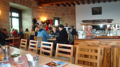 Как это замечательно попасть в теплое и уютное помещение после прогулки по Орлиному гнезду, где даже в конце августа уже может лежать снег (как это случилось во время нашего его посещения). Многие туристы воспользовались услугами этого ресторана, чтобы согреться и подкрепиться. В том числе и мы, ограничившись, правда, кофе и яблочными пирогами. Но даже такой перекус очень помог нам восстановить силы перед спуском вниз и последующей экскурсией в долину и теснину Вимбахкламм.
