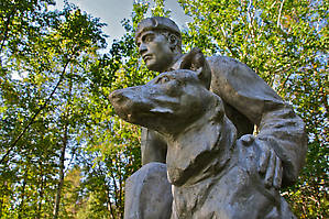 Даже центральный в поселке памятник пограничнику был очень светел и позитивен. Все-таки поселок находится внутри пограничной зоны и многие работают на границе. И Мухтар тоже хорош — чувствуется что враг не проползет по-пластунски в ближайшей роще... Так что самое время пожалуй переименовать мою заметку про границу