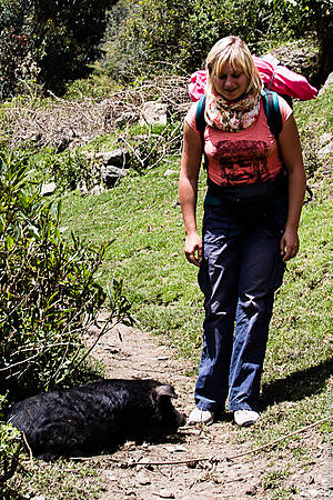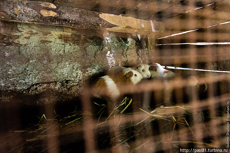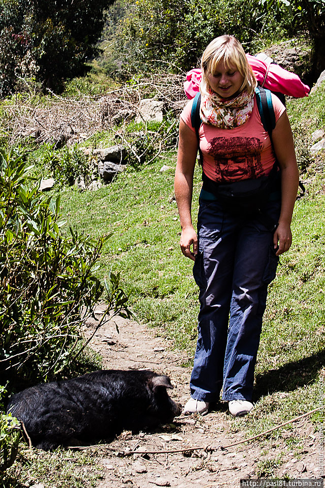 Пока тропа не покидает населенную долину, у пешехода есть возможность заглянуть в некоторые местные домики. Попадаются специальные указатели, где что находится. Например, "centro de produccion de cuyes" с картинкой толстого хомячка. Здесь разводят хомяков-переростков, название которых в русском языке мне не известно. По-английски Guyiney pig — Гвинейская свинка. Разводят их на продажу в качестве еды. Полакомиться этими милыми зверушками мы пока не созрели, уж больно они напоминают домашних животных. Хотя кроликов ведь едят? В жареном виде свинок не предлагали, так что без особого сожаления оставили этот кулинарный опыт на потом.