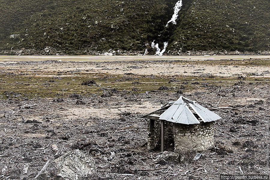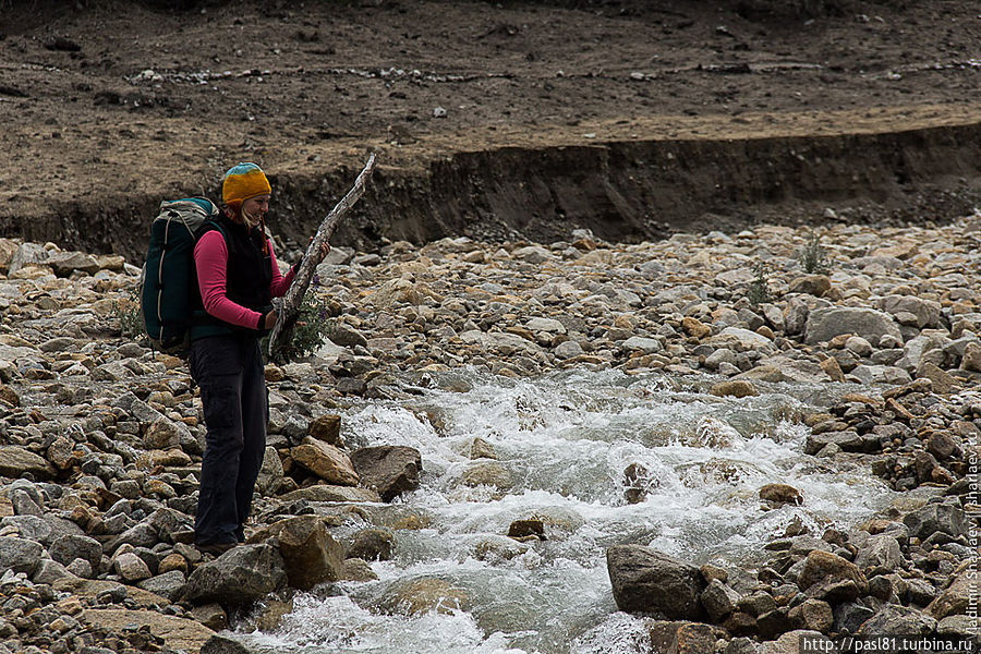 До большой лагуны, которую мы видели еще с перевала, тропа идет по новообразовавшейся пустыни. Приходиться перебираться через многочисленные неглубокие ручейки. Наташа бродит, ищет проход. Ей не нравится место, где я перепрыгивал, нашла палку толстую и пытается с ее помощью перейти.