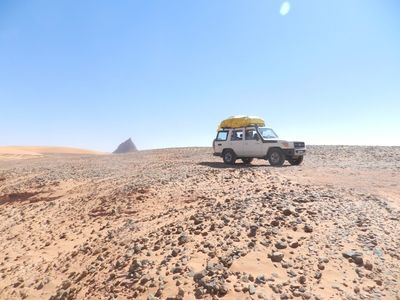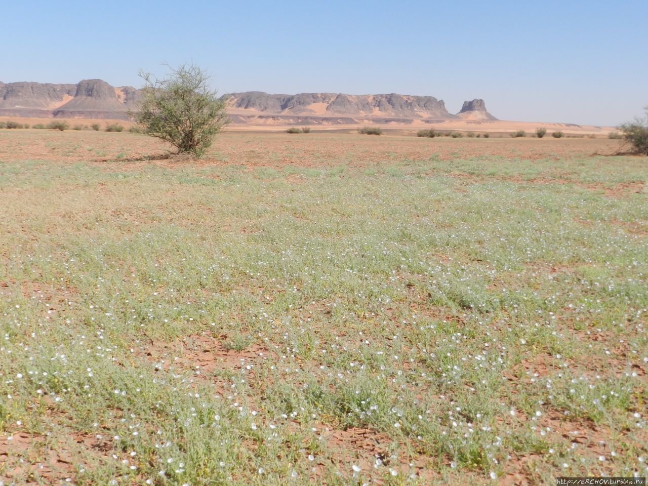 После завтрака собираем лагерь и выдвигаемся по маршруту. Солнце из ласкового и доброго с каждой минутой становится всё безжалостней и агрессивней. Осознавая свою трудную долю, дрожат на утреннем ветру реденькие травинки. Четыре джипа, подобно птицам, набрав скорость, летят по ровной как стол Сахаре.
