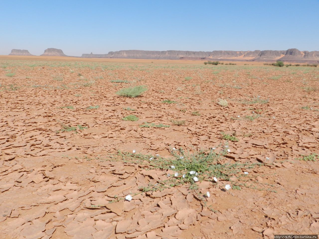 Совершаем техническую остановку. Отправившись на прогулку, по растрескавшейся земле определяю, где в сезон дождей проходил поток. Зато порадовали вьющиеся по земле цветочки, своим внешним видом напоминавшие родные вьюнки колокольчики.