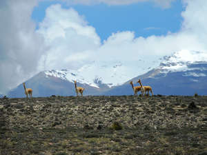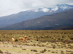 Викуньи на фоне вулкана