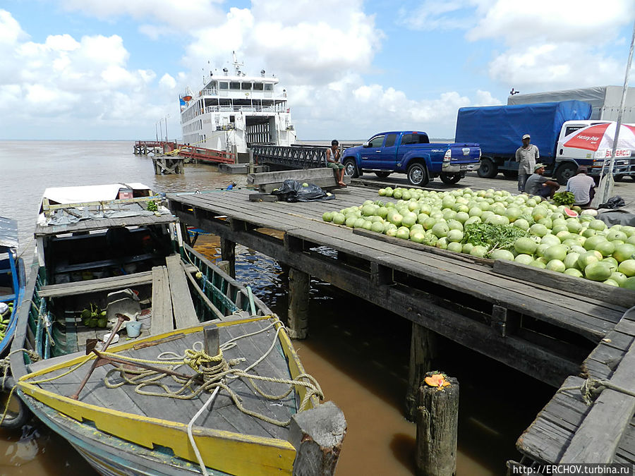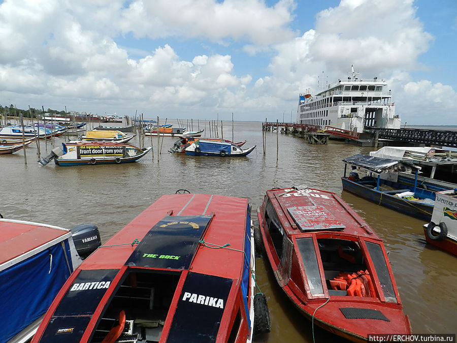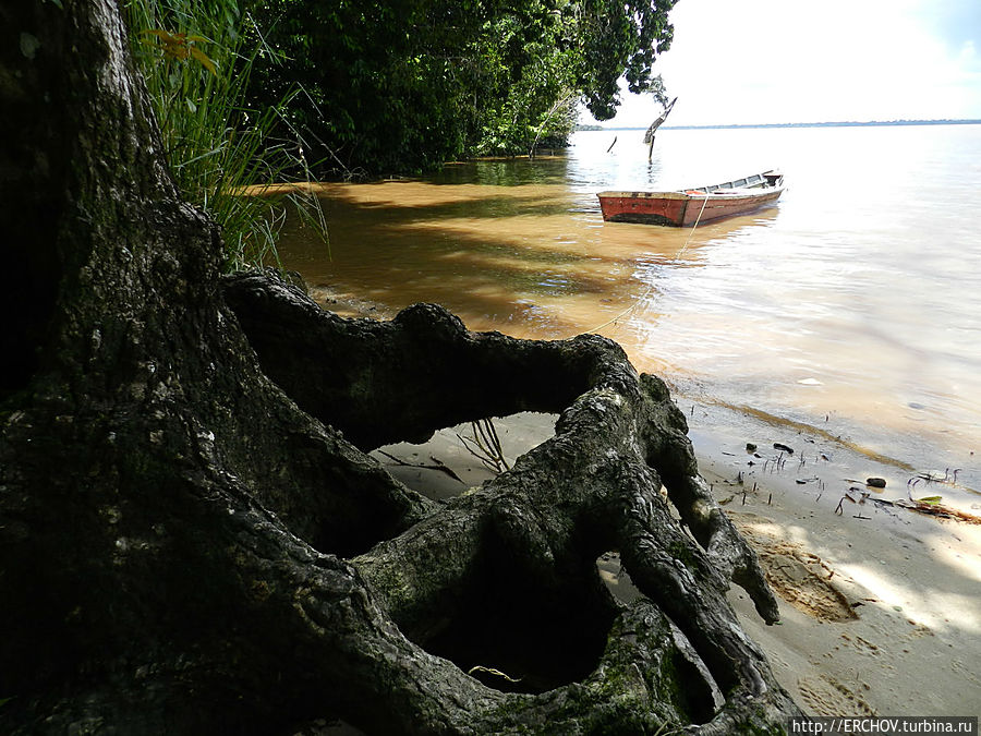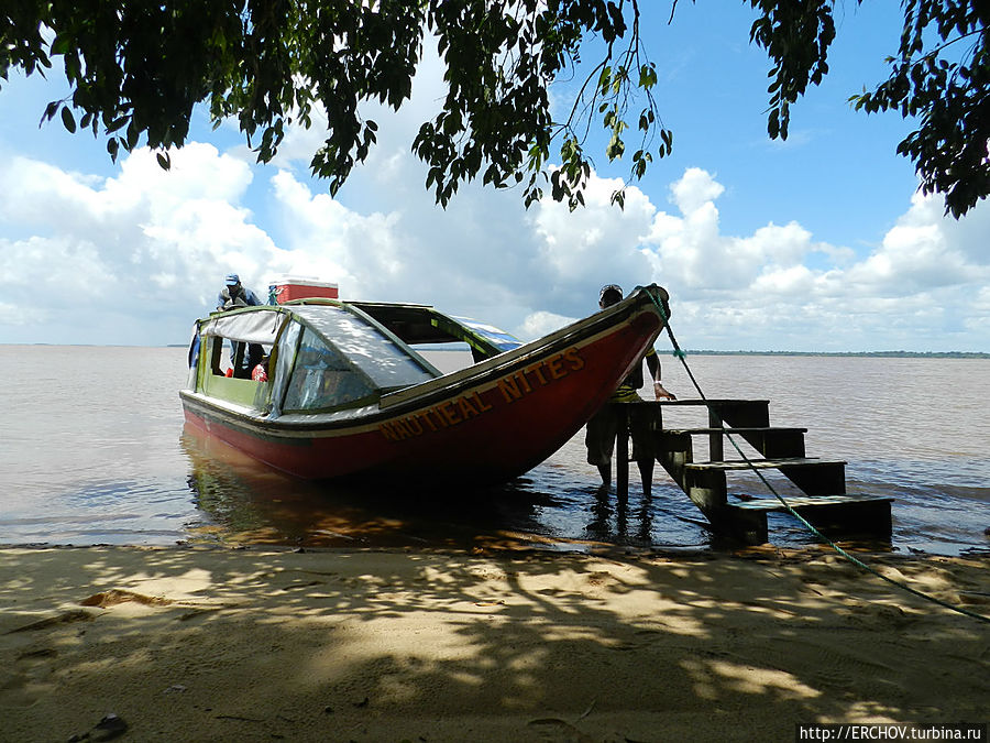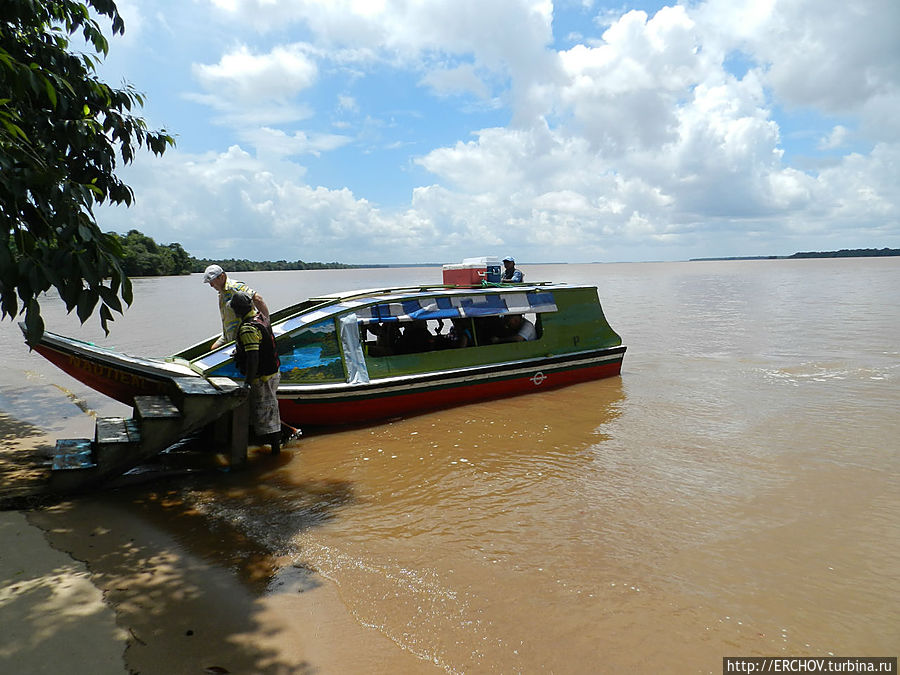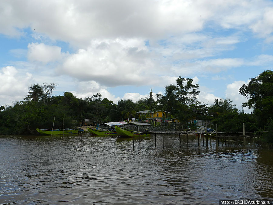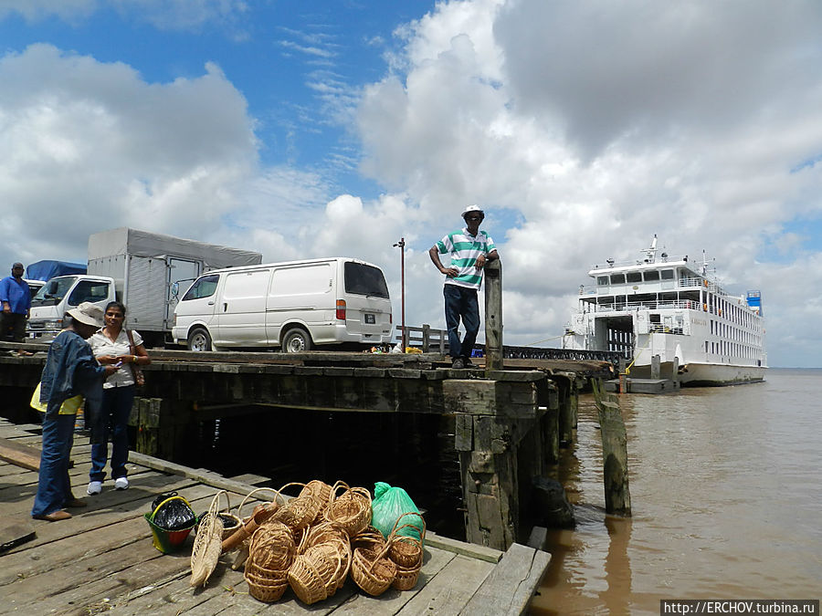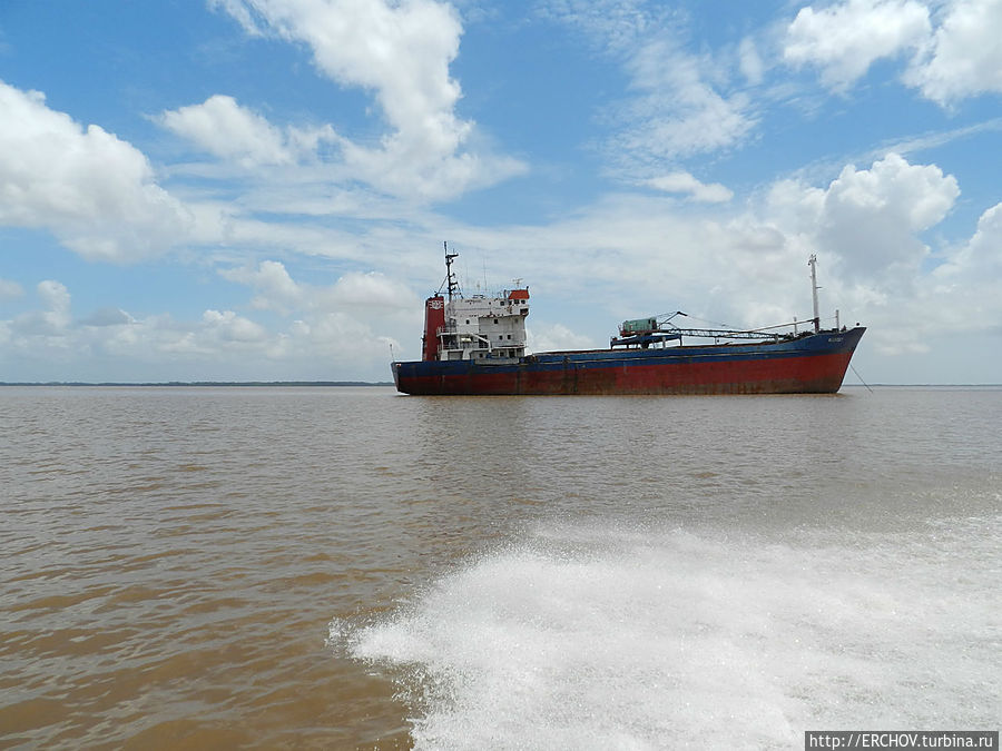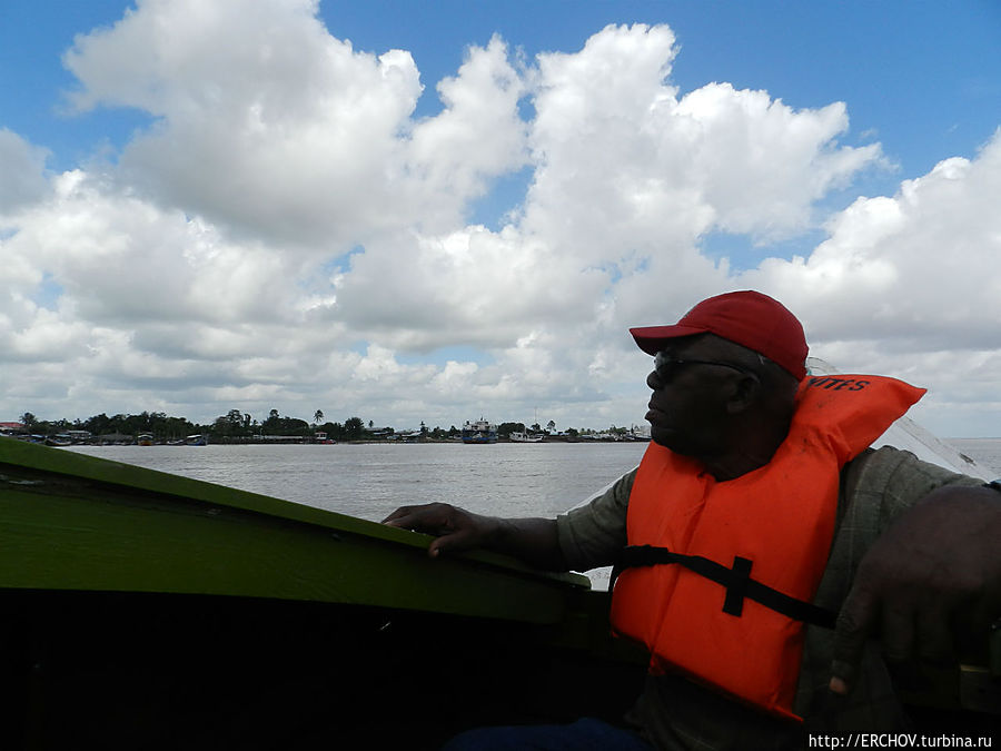 Рядом с ним устроен базар, где темнокожие люди галдят, предлагая друг другу товар. На рейде пришвартовано большое грузовое судно, которое ходит по морю.Арендуем лодку с крытым верхом и загружаемся в неё, надев спасательные жилеты – с этим здесь строго. Кстати, народ на подобных лодках как прибывает в порт Парика, так и убывает весьма активно. Реки в Гайяне во все времена были и остаются основными дорогами. При нас на причал выходили прилично одетые люди с чемоданами.