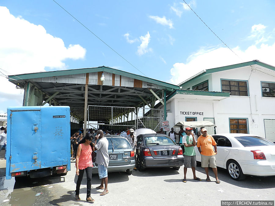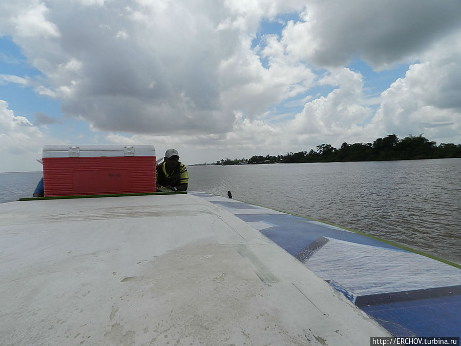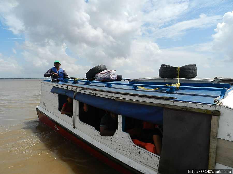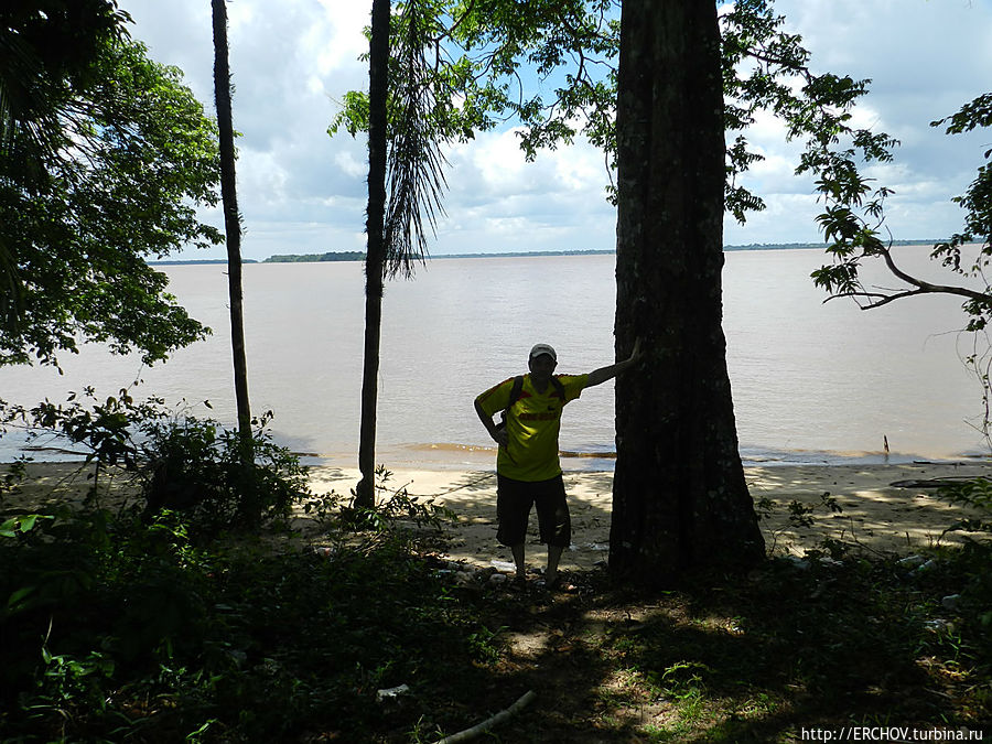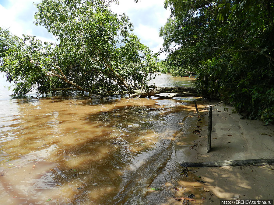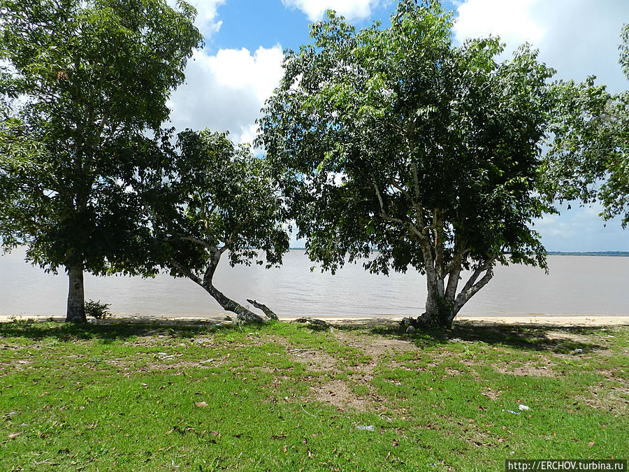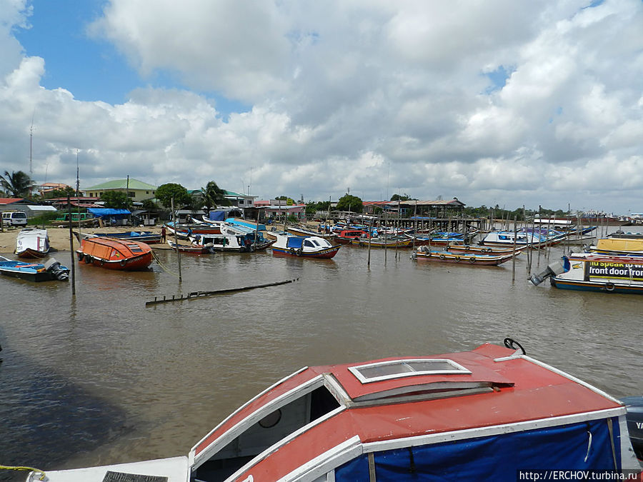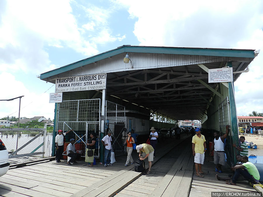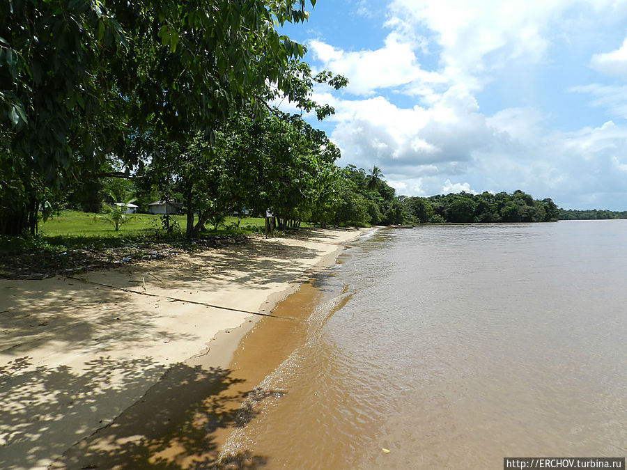 Рядом с ним устроен базар, где темнокожие люди галдят, предлагая друг другу товар. На рейде пришвартовано большое грузовое судно, которое ходит по морю.Арендуем лодку с крытым верхом и загружаемся в неё, надев спасательные жилеты – с этим здесь строго. Кстати, народ на подобных лодках как прибывает в порт Парика, так и убывает весьма активно. Реки в Гайяне во все времена были и остаются основными дорогами. При нас на причал выходили прилично одетые люди с чемоданами.