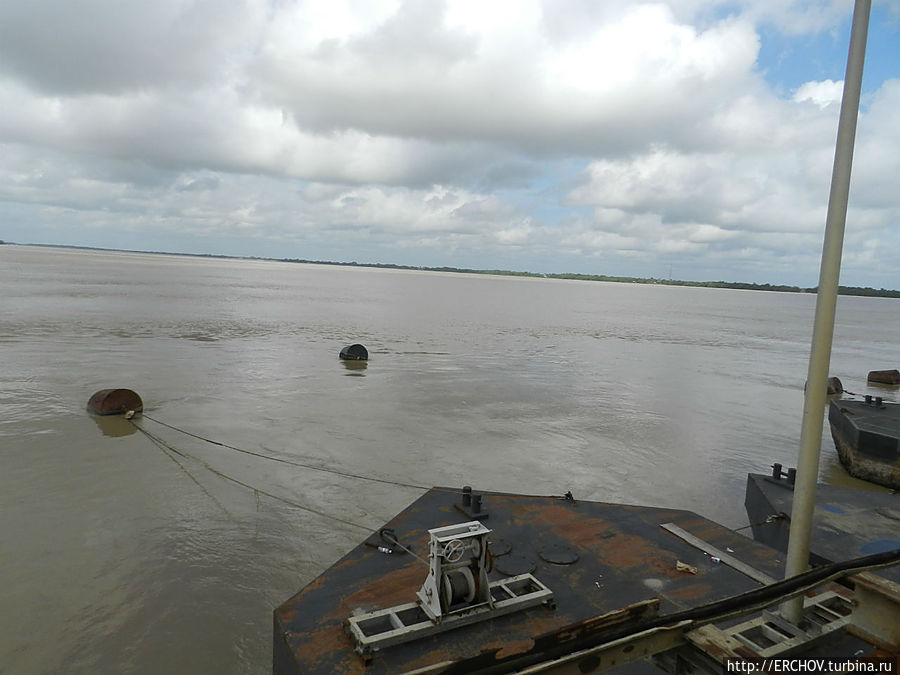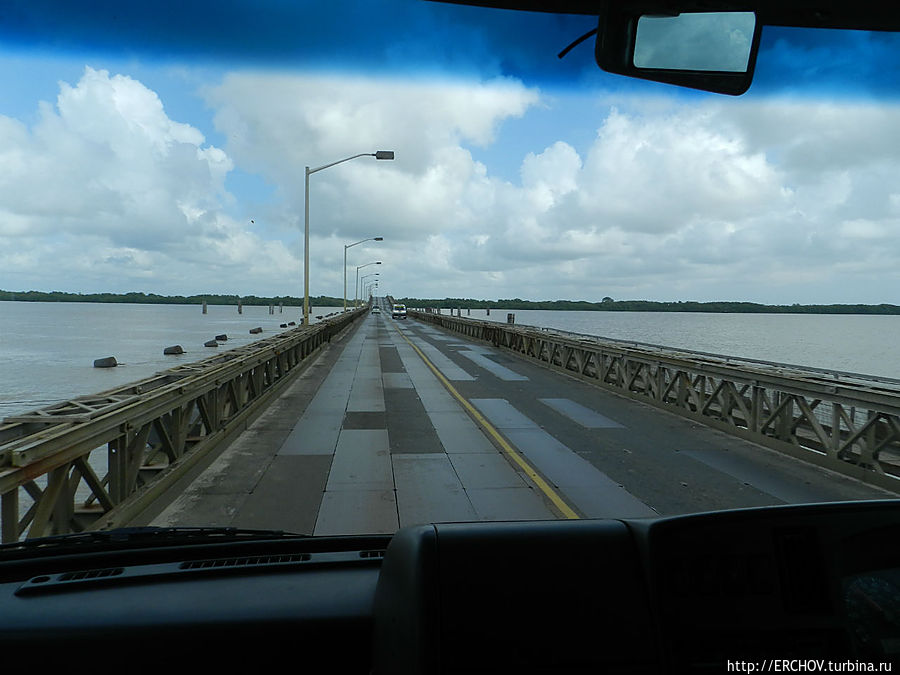 Выезжаем в направлении городка Парика. Дороги в Гайяне узкие, случаются пробки, но ранним утром движение свободное. По самому длинному в мире понтонному мосту переезжаем через Демерару. Конструкции моста гремят на стыках, и быстрые коричневые воды реки готовы подхватить жертву. Однако, мост хоть и шумный, но очень надёжный.