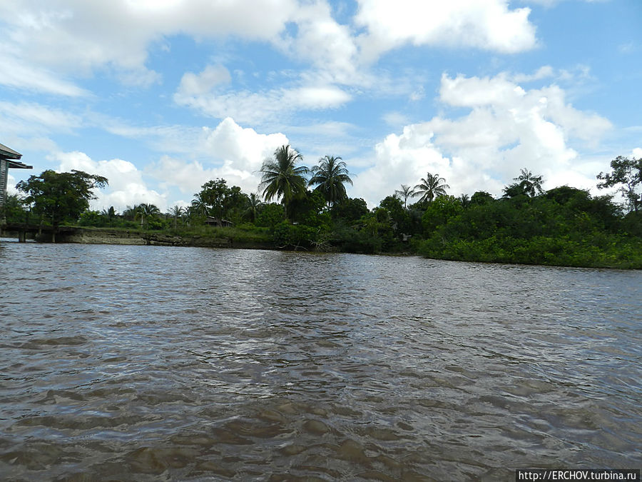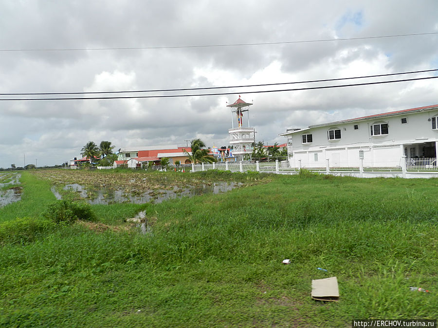 Вскоре справа показывается серьёзная дамба, за ней большая вода, которую можно назвать как Атлантикой, так и устьем Эссекибо. От дамбы вглубь территории тянутся каналы, каналы, каналы…. Наверно от Нидерландов всё это отличается лишь обилием банановых кустов, пальм и наличием бедных домов, и чем дальше от столицы, тем беднее.