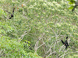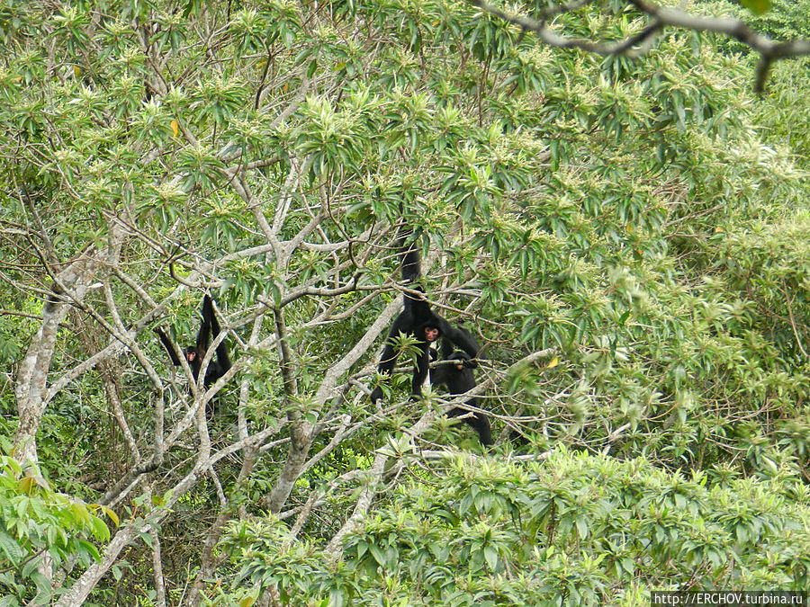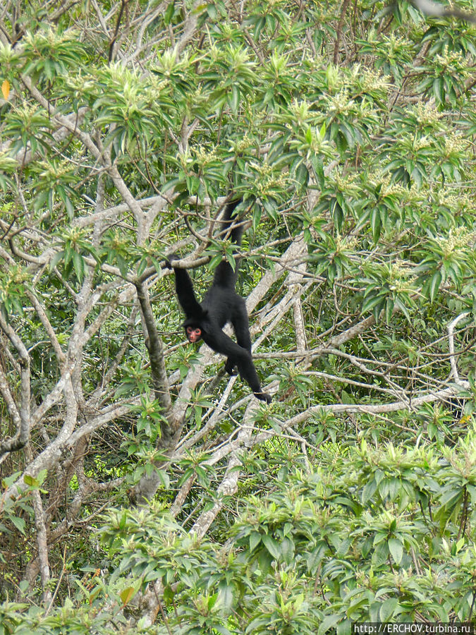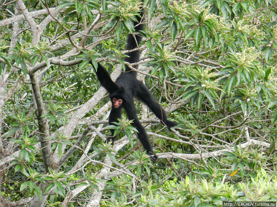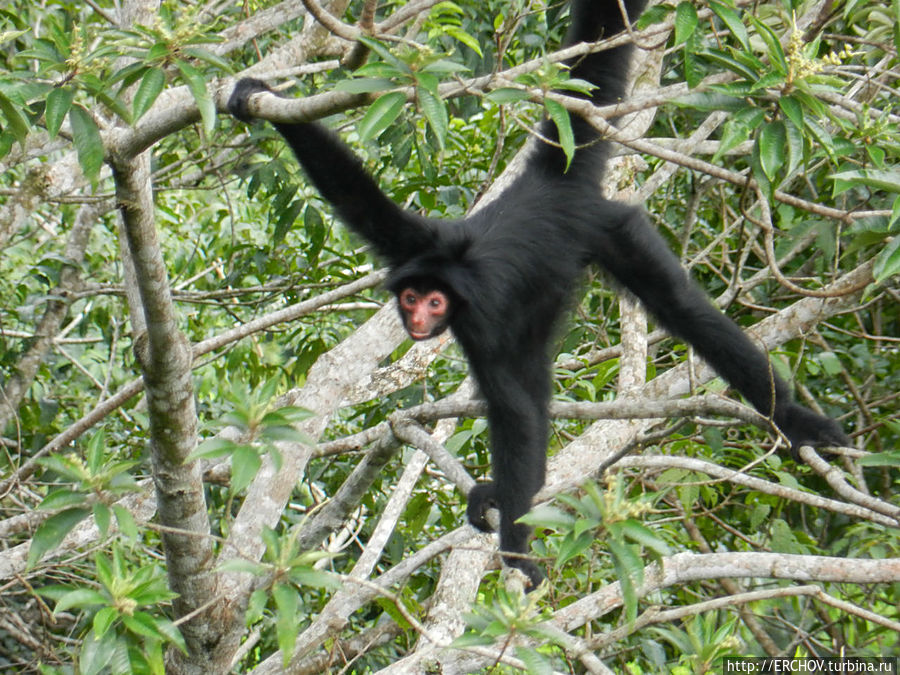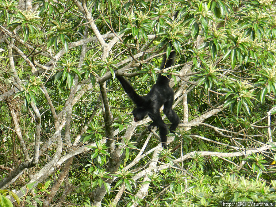 Самец что-то буркнул, самка с детёнышами удалилась, и глава семейства устроил для нас настоящее шоу. Самец приближался метров на 30, и, стараясь напугать, начинал передними лапами с силой теребить ветку. Потрясёт, остановится и смотрит на нас. Сам он весь чёрный, и когда развешивается, цепляясь за ветки хвостом и лапами, то становится похож на паука. Обезьяны эти так и называются паукообразные.
