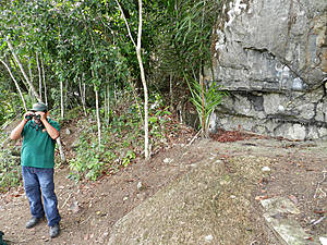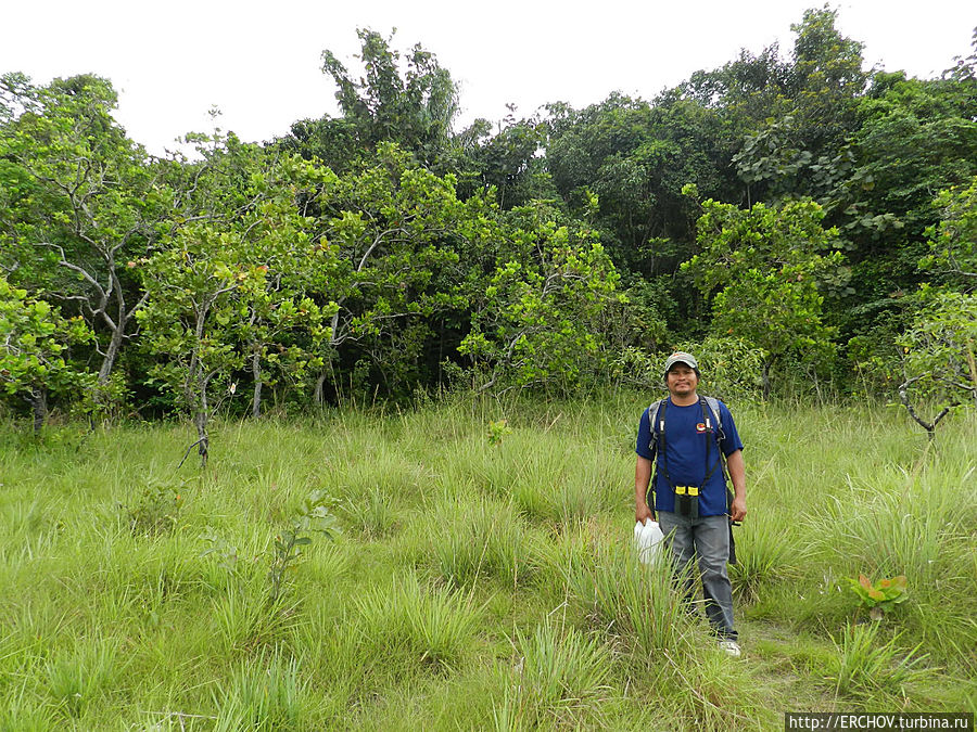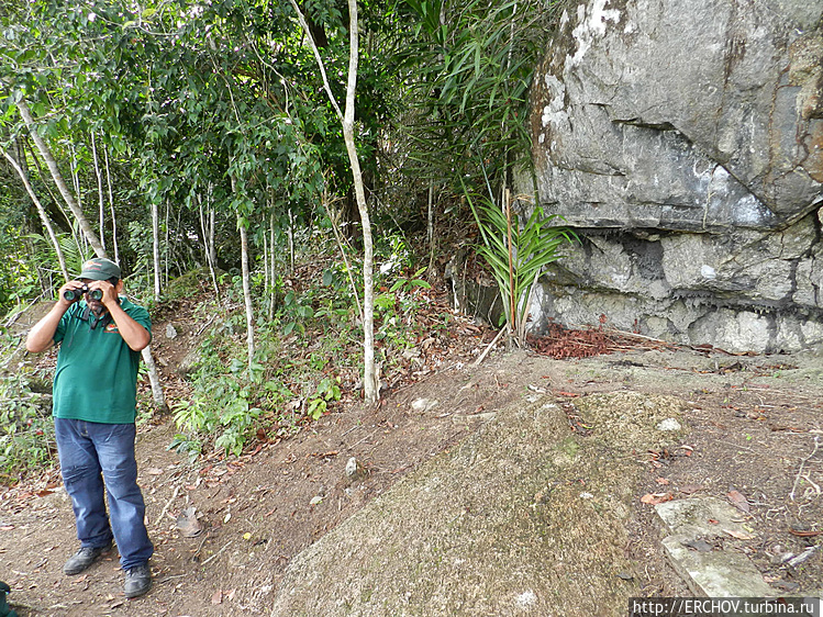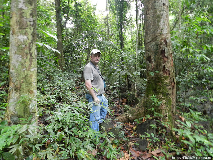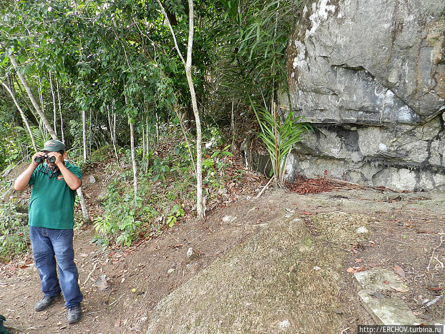 В лесу никого нет. Стараемся идти тихо, отодвигая колючки и перешагивая через упавшие ветки. Под ногами чуть слышно шуршит мягкий ковёр из влажных длинных листьев. И этого хватает! Сразу со всех сторон, начинают предательски орать птицы, передавая сигнал дальше. Обезьяны замолкают.