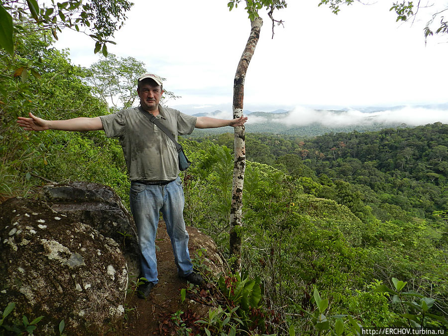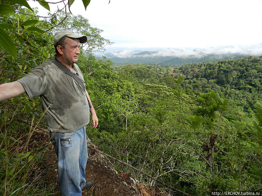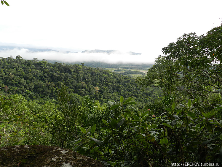 Влажность жуткая. Я весь мокрый. Наконец достигаем обзорной точки. Открывшийся вид на опоясанные туманом, словно нимбом горы и на долину выше всяких похвал. Отдыхаем. Через некоторое время в 50 метрах от нас кроны деревьев зашевелились. В нашем направлении движется кто-то скрытый от глаз листвой. И точно, из-за листьев показались 5 обезьян. Увидев нас, зверьки остановились. Это их место и они явно не ожидали кого-то здесь увидеть.
