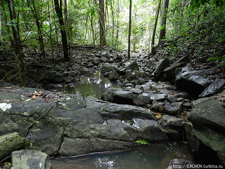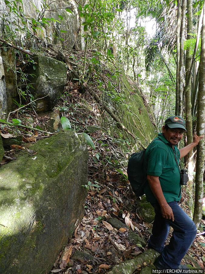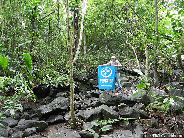 Чем выше, тем крупнее камни, скорее это валуны Божьим предназначением сложенные в пирамиду под названием гора Сурама. Доходим до того места, где из горы сочится ручей. Индеец рассказывает, как этот маленький ручей иногда превращается в бурный и грозный поток, который вырывается из под земли и крушит на своём пути деревья. Даже не верится, что подземная река, словно сварливая злая женщина, может вот так просто выплеснуть из себя всё, а затем просто слегка капать, словно кто-то под землёй открывает и закрывает кран.