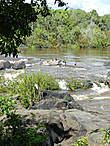 Кормчий сворачивает в тихую заводь и замедляет ход. Приближаемся к чёрным валунам, образовавшим островок. Впрочем, «тихая заводь» мало к какому месту на Эссекибо подходит, вода везде идёт мощным потоком на хорошей скорости.