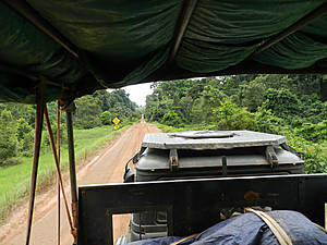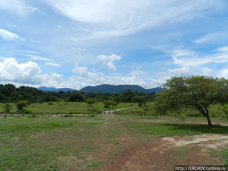 Сразу за КПП уходим с трассы вправо. Через час, объехав появившиеся горы, наш грузовик вырывается из надоевшего леса в саванну. Тропический лес конечно прекрасен, но он создаёт некое ощущение замкнутости. Саванна, с её возможностью обзора окрестностей, в этом плане куда как приятней.