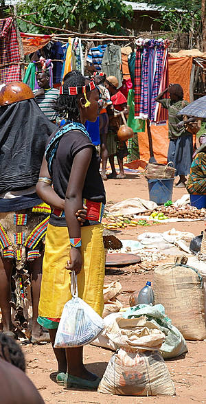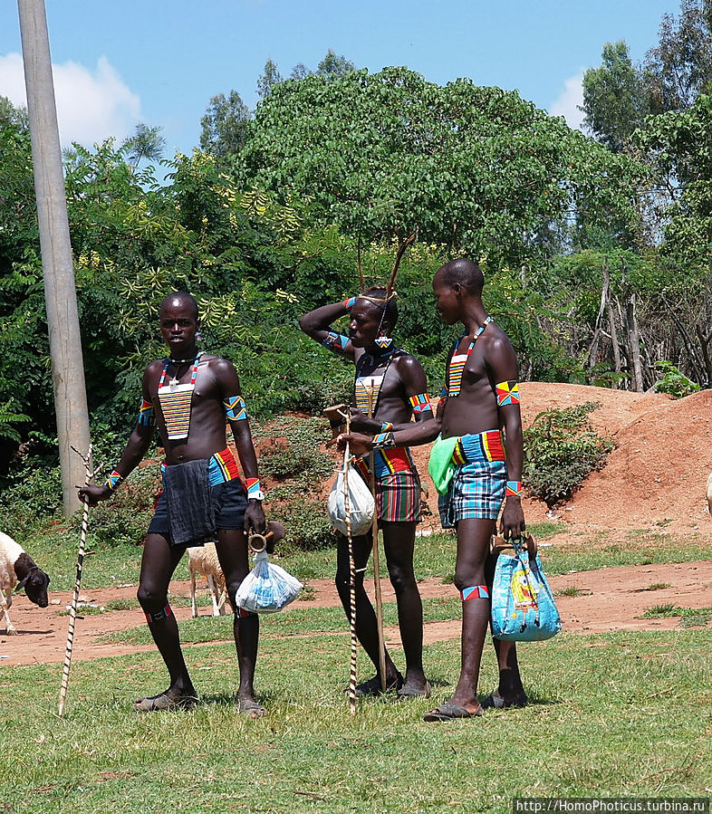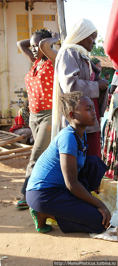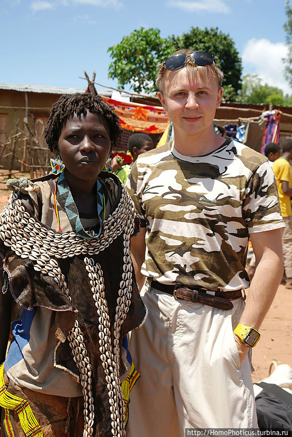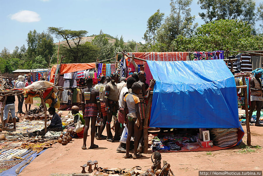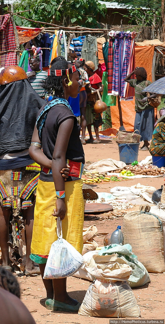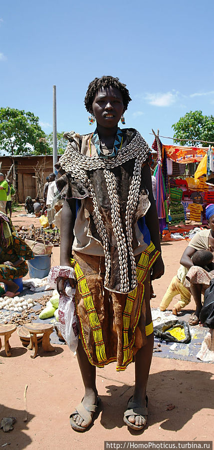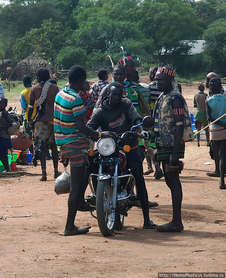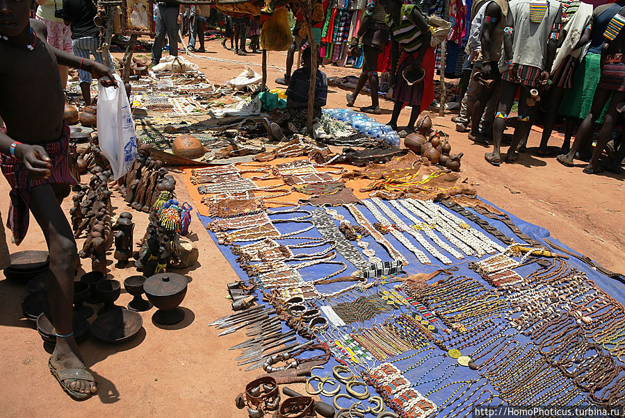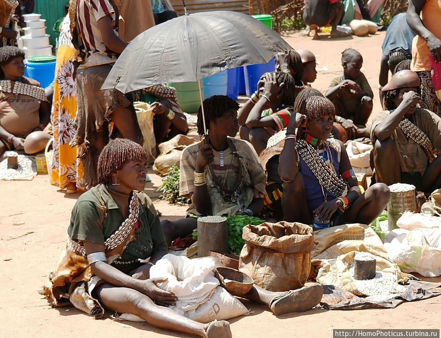 Но на рынке ведь для туриста главное вовсе не товары, а типажи — на обычном рынке покупают-продают женщины, а мужчины — так-для красоты, понта и охраны . К сожалению, на всем рынке не нашел ни одну женщину полностью в национальном наряде хамер и бенна, они все же слишком практичные и даже те, что не прочь пофотографироваться, защищали свои драгоценные кожаные лохмотья лохмотьями китайских футболок, максимально приближенных к цвету собственной кожи. Одну такую вызвал на честное позирование, пару бырр за фото. Мужики, только-только прошедшие отряд инициации, борзели сильнее, поэтому выбрал одного такого красавчика и тоже запечатлел . Остальных фотографировал тайком, зато более естественных :)