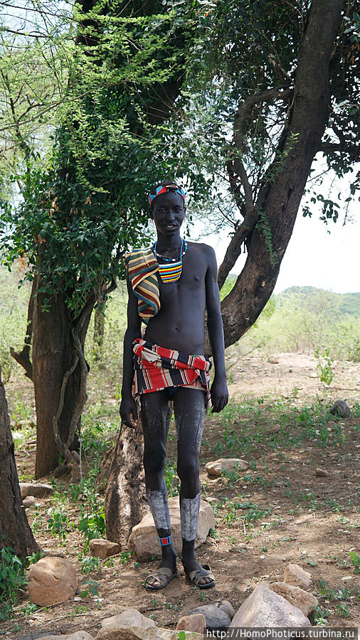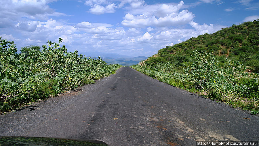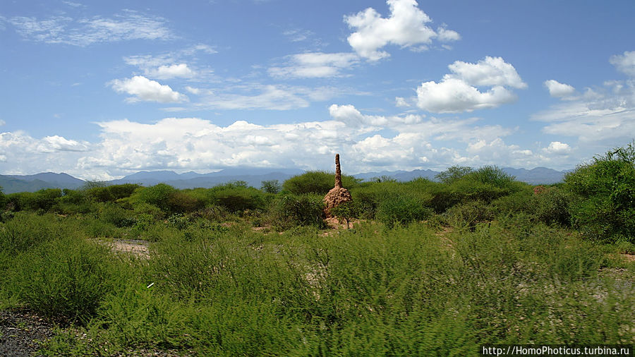 Карат Консо поехал на запад, спустился до 550 метров над уровнем моря, и въехал на территорию практически вымирающего народа цамай , так как в этом жарком климате заниматься адекватным земледелием и скотоводством практически невозможно, поэтому молодежь при заключении брака старается по возможности покинуть сие негостеприимное место. По сторонам дороги во избежание ее размытия редкими, но сильными дождями, посажено совершенно бесполезное дерево Адамово яблоко , хотя его вялые плоды на ощупь ассоциируются с несколько иной частью тела Адама, а их сок вообще обжигает . Началась пустыня, правда, пустыня зеленая, называется Уэйто по одноимённой реке и одноименному городишке-деревеньке , в свою очередь, названному по одноимённому почти вымершему племени в 500 человек (ни одного представителя которых не видно), в котором остановились на полчасика выпить пива и дать отдохнуть машинеЕдинственное, что порадовало на этой территории — огромные столбы термитников, выше стволов акаций, , а также скучающий парень из цамаев , которого вызвали на фотосессию.