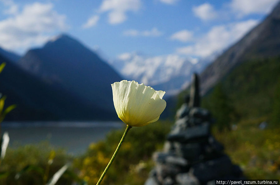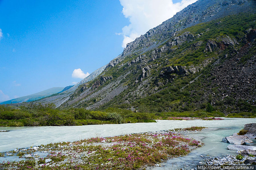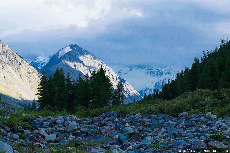 К Белухе мы шли по долине реки Аккем, превозмогаю трудности перехода: тяжелый рюкзак, набитый припасами и тёплой одеждой (ночью холодно, одежда нужна, а днём тепло и даже жарко – приходится нести одежду в рюкзаке на своих плечах), неровная каменистая тропа, с торчащими кореньями, заросли различных растений, иногда бурелом, многочисленные броды, перевалы и прочие горные прелести. Всё это создавала у меня ощущение не просто похода, а паломничества к великой горе, паломничество через трудности и преграды. После трудного перевала бы даже хотелось свернуть назад, но эти мысли быстро ушли, заменившись вдохновением от окружающей красоты.