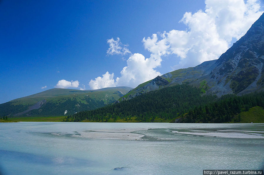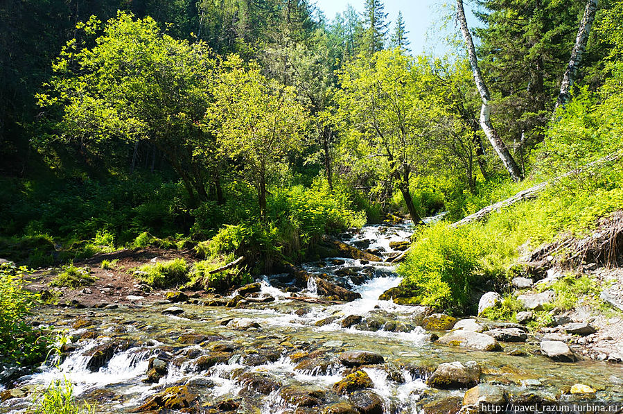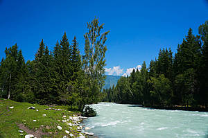Наш с попутчицей путь начался от посёлка Тюнгур, расположенного на реке Катунь. Катунь, как известно, является главное артерией Алтая. Эта крупная река всё еще не перекрыта плотиной, что делает её особо привлекательнее для путешественников. Берёт она своё начало от ледников всё той же Белухи, неся, можно сказать, её благословенную энергию через весь Алтай. Катунь обладает невероятно красивым бирюзовым оттенком, а вода в ней столько чистая, что её можно свободно пить. К слову сказать, на протяжении всего похода по Алтаю мы пили воду из многочисленных рек, речушек и ручьёв. А красавица Катунь, воспетая еще Николаем Рерихом, воистину является хозяйкой Алтая!