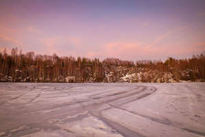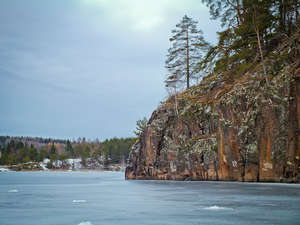 Хотя при этом до места начала второй задуманной прогулки мы всё же доехали, дабы окончательно убедиться в том, что и здесь на лёд выбираться не следует, и в том, что мы всё же слегка долбанутые. По пути заскочили посмотреть кирху в Лумивааре. Заночевать же решили недалеко от посёлка Импилахти, чтобы утром посмотреть на ещё одну из достопримечательностей Приладожья, которую все предыдущие разы мы как-то обделяли вниманием, — вертикальную скалу на берегу залива высотой порядка 70 метров. Лёд в заливе Импилахти оказался куда более основательным, поэтому гулять здесь было вполне комфортно. А замёрзшие за ночь лужи на его поверхности превратили весь залив в один большой гладкий каток, что ещё и добавило простой детской радости к процессу.