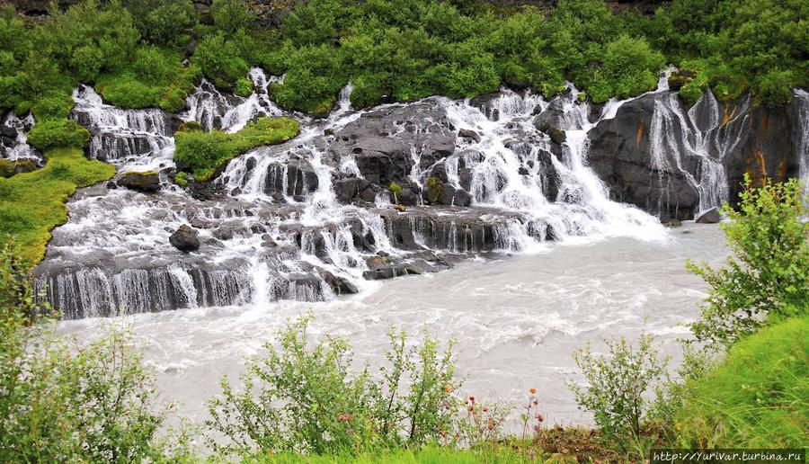 И, поскольку порода лавы пористая, река без труда просочилась в неё и вот здесь, на протяжении одного километра, подземная река выбирается наружу, образуя видимые нам многочисленные водопады. Отсюда и произошло название водопада: «hraun» — по исландски — «лава».
