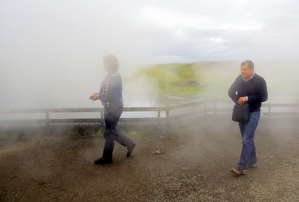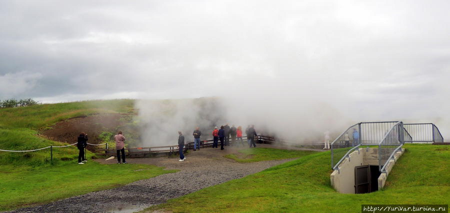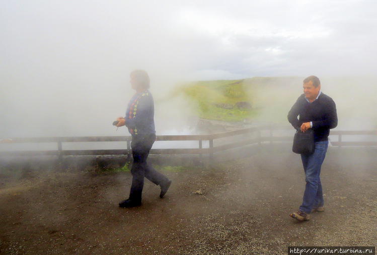 Неподалеку от нее для туристов оставлен кусок естественного выхода этого кипятка – здесь невысоко бурлят несколько гейзеров. Все вокруг этого участка окутано паром. Для желающих потрогать воду стоят надписи – температура 100 градусов!