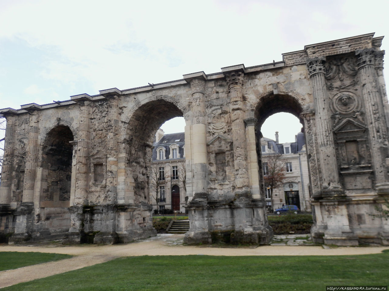 Эта самая большая Триумфальная арка, сохранившаяся со времен Римской империи, она фактически состоит из трех арок. Двести лет назад были снесены все здания, окружавшие эти городские ворота и с тех пор самый древний памятник Реймса можно рассмотреть со всех сторон.