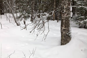 Идется по тропе хорошо до самого берега озера, а потом... а потом если хватит упрямства и сил, то можно выйти прямо к дому визит-центра, но готовьтесь к тому, что это будет самый сложный путь из всех, что Вы прошли за последние дни. Парадокс, но это так и есть. Снег тут мягкий и совсем не утоптанный и потому через шаг проваливаешься уже не по колено, а по самый пояс.
