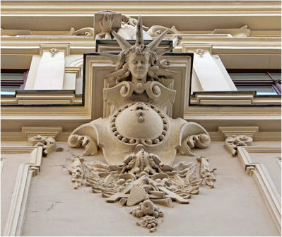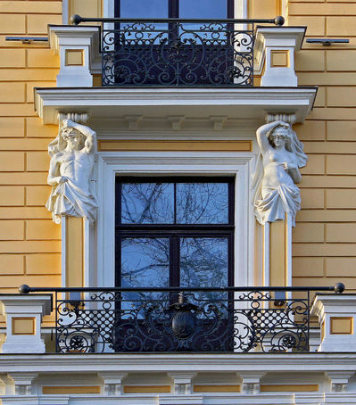 Эту композицию, венчающую фасад дома по адресу Элизабетес 10а придумал знаменитый Михаил Эйзенштейн — отец будущего кинорежиссера Сергея Эйзенштейна.