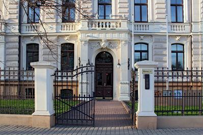 Входную дверь украшает один из главных символов масонов – циркуль и угольник. В Риге очень многие дома имеют символику масонов.