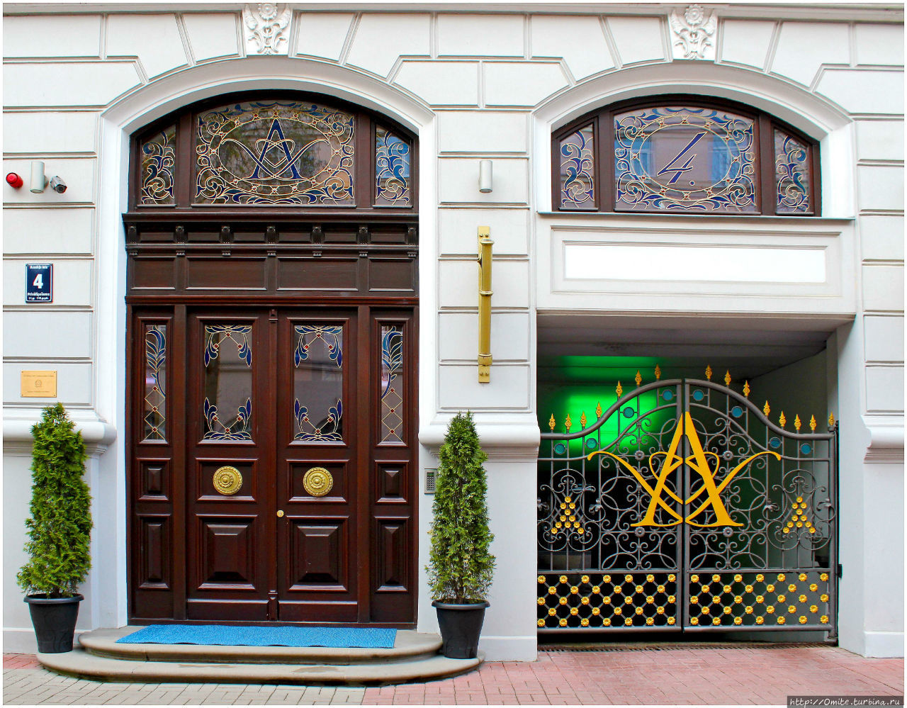 Можно не смотреть на табличку, чтобы узнать адрес этого дома – и на дверях, и на воротах буква А и цифра 4. Аусекля 4.