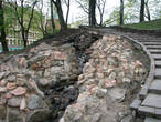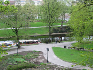 Мы воспользовались советом врачей и поднялись на горку один раз, а потом пошли гулять по парку в сторону ж.д. вокзала. Прямо под горкой протекает канал , который повторяет очертания старых развалин и бастионов города крепости. Сейчас здесь находится остановка прогулочного катера , на котором можно по каналу проплыть до Даугавы, затем прокатиться по самой реке и опять попасть в канал.