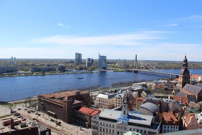 Кстати, башня — не единственная смотровая площадка в Риге, но мы успели побывать только здесь. Для информации и по отзывам отмечу, что интересно будет глянуть на город и с телебашни. Ещё хвалят бар Skyline, виды из ресторана гостиницы Islande, а также террасу торгового центра Galleria Riga. Здесь высота поменьше, но за счёт этого городские постройки кажутся ближе. А я пока покажу то, что можно увидеть с башни.