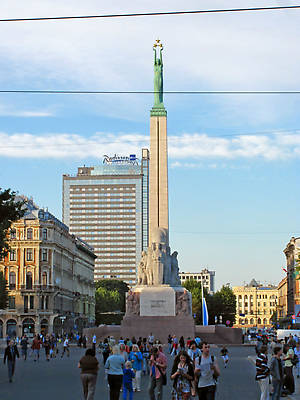 У изголовья канала стоит национальная Опера, а на широком бульваре, пересекающем его — памятник Свободы. Девушка держит на вытянутых руках 3 звездочки – символ 3-х исторических областей Латвии: Курземе, Видземе и Латгале. Между прочим, памятник соорудили на людские пожертвования.