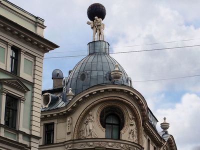 Атланты держат земной шар на крыше здания по ул. Театра, 9Всё богатство рижского Югенстиля, конечно, не вместить в один материал. В центре более 800 прекрасных, не похожих друг на друга домов относятся к этой категории, а мы не успели увидеть и двадцатой части. Но, главное ведь что? Почувствовать и, в идеале, полюбить город. Это в Риге сработало! Не отнять.