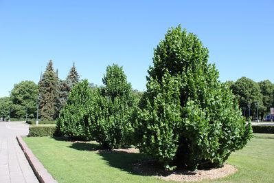 Пирамидальные деревья в парке — это Граб обыкнове́нный, или европе́йский, (Cárpinus bétulus).