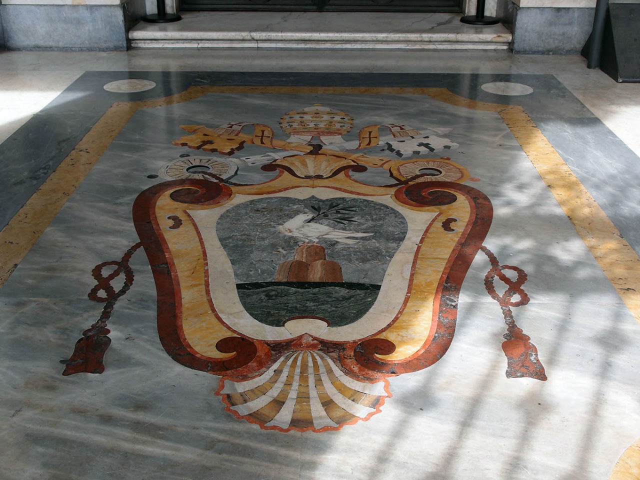 Так, 75-метровая колокольня, кстати, самая высокая в Риме, датируется 1377 годом, а нарядный фасад с портиком и лоджией построен в 1740-ом. Но основная часть архитектуры базилики, действительно, не менялась с V века, и за колоннами лоджии находится старый фасад церкви, украшенный мозаиками XIII — начала XIV веков.