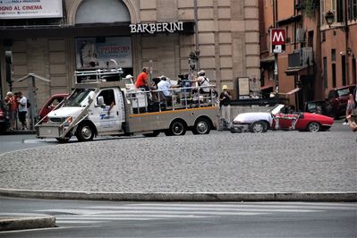 Но мы отправились в сердце Рима к Колизею. По пути на одном из колец мы застали съемки какого-то фильма. Герой фильма ехал на красной машине, а точнее, его тащила за собой съемочная группа... Кольцо не перекрыли, автомобили и реальные люди стали массовкой. Может и мы попали в кадр... кто знает))