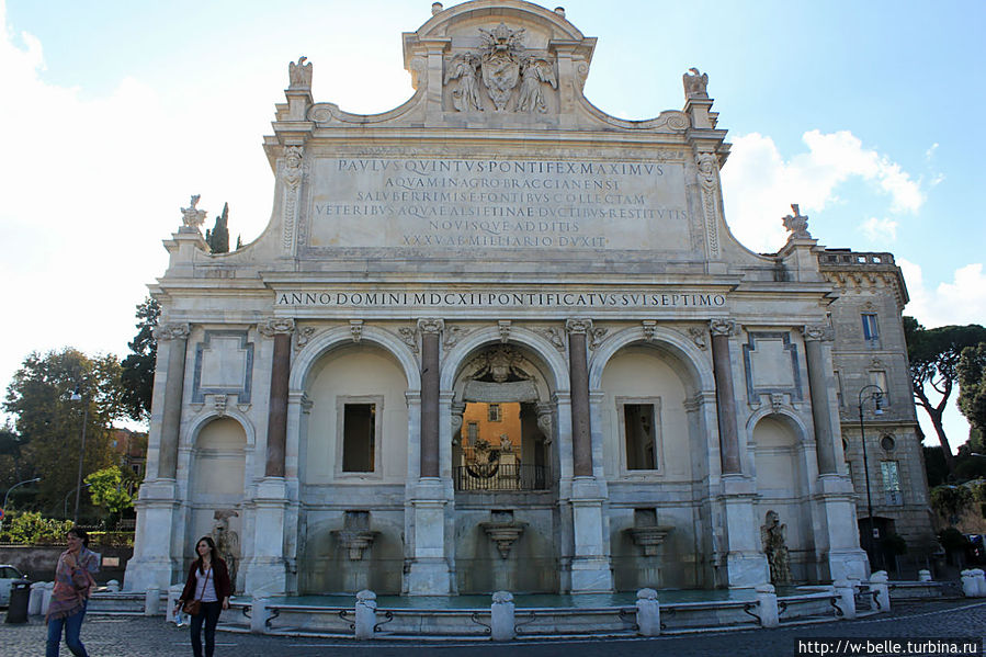 Дорога ведет вдоль парка. На вершине холма заканчивается древний акведук времен Траяна. позже здесь соорудили самый оригинальный римский фонтан Аква — Паола, выполненный в форме церковного фасада, из-под трех арок которого изливаются потоки воды.