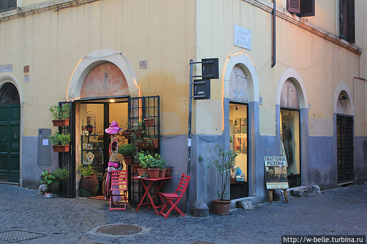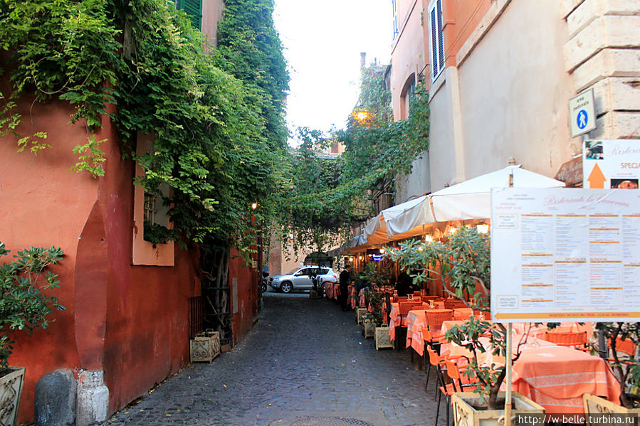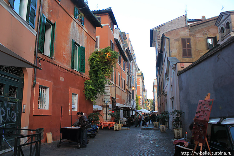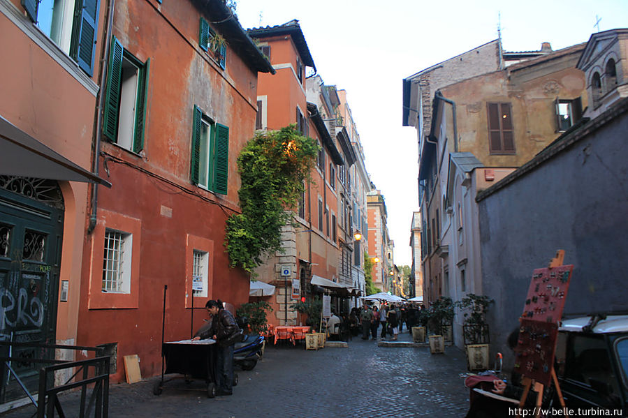 Попадая в Трастевере, ты ощущаешь, что время словно остановилось несколько веков назад, заплутав среди мощенных булыжником узких улочек, петляющих между увитыми плющом обветшалыми фасадами невысоких домов. сохранились окованные железом двери, деревянные колеса на стенах, пестреющие цветами окошки с тяжелыми ставнями, на улице сушится белье.