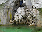 что символизирует отсутствие знаний, некоторую темноту, о его истоках. Дунай рукой указывает на один из гербов Папы символизирующих его власть над Европой и всем миром. В руках Ганга длинное весло отсылающее нас к его судоходству. А около Ла-Платы растут кактусы и лежат серебрянные монеты намекающие на название реки (Ла-Плата с испанского Серебряная река).Питается водой фонтан из древнего акведука ”Acqua Vergine", питающего и другой знаменитый фонтан Рима —