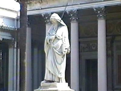 Мы погрузились в автобус и мимо Римского Цирка (наблюдали из окна) направились в базилику Святого Павла – одну из четырех патриарших базилик Рима. В своем нынешнем виде базилика существует с середины XIX века и, во многом, благодаря Николаю I, вложившим средства в ее восстановление после пожара. Впечатляет скульптура Святого Павла на площади и медальоны с изображениями римских пап. Останки апостола Павла были обнаружены здесь лишь в 2009-ом году, много позднее нашего посещения!