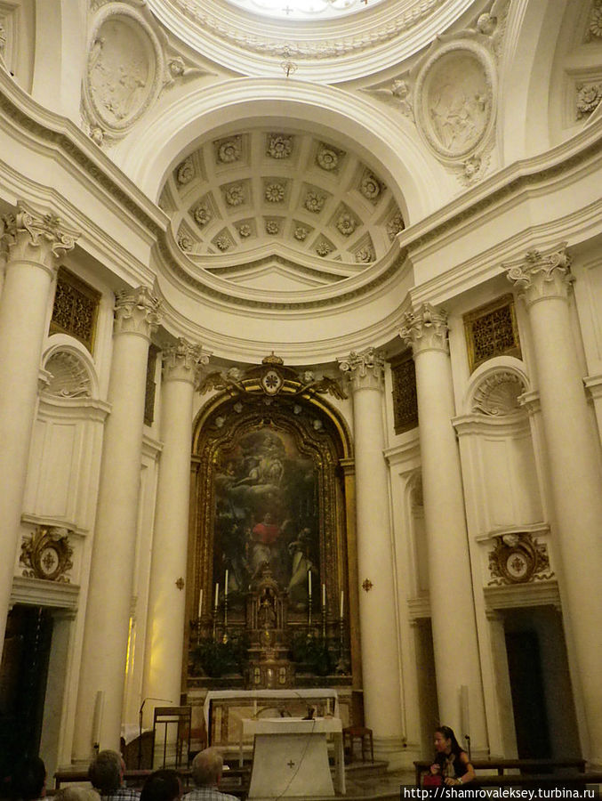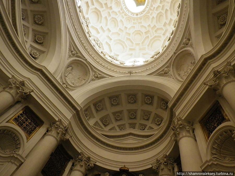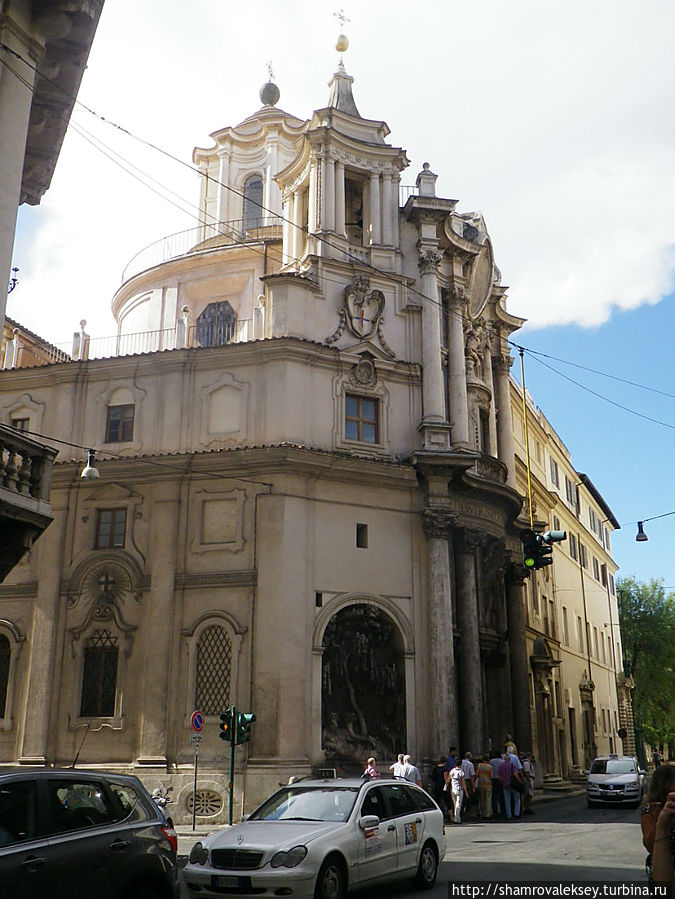 боковым фасадом выходящая на узкий перекрёсток — площадь Четырёх Фонтанов — стала главным открытием в Риме. Как и все творчество Франческо Борромини.Входя под своды церкви, попадаешь в изощрённое пространство вогнуто-выгнутых линий, словно барочная жемчужина вернувшаяся в лоно ракушки-жемчужницы.
