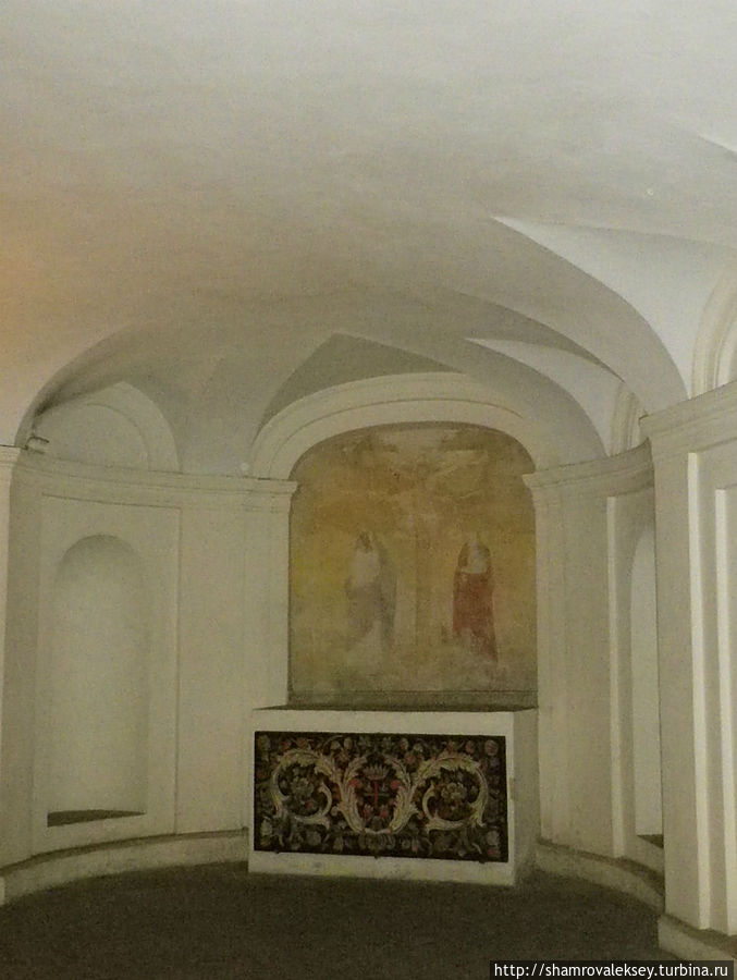 В подвале церкви небольшой склеп, в котором автор церкви хотел найти своё последнее пристанище, но не случилось.