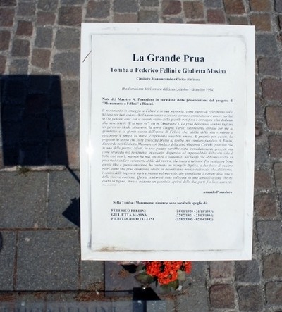 По сравнению с шикарными надгробиями других жителей Римини памятник не так заметен и помпезен. Но запоминается...Позже узнала, что он символизирует нос корабля из фильмов Мастера.В могиле похоронены он,Джульетта Мазина и их сын, проживший 2 недели всего. Мы положили ирисы(которые купила на рыночке около кладбища) на надгробие,..вернее в бассейн,который омывает обелиск...