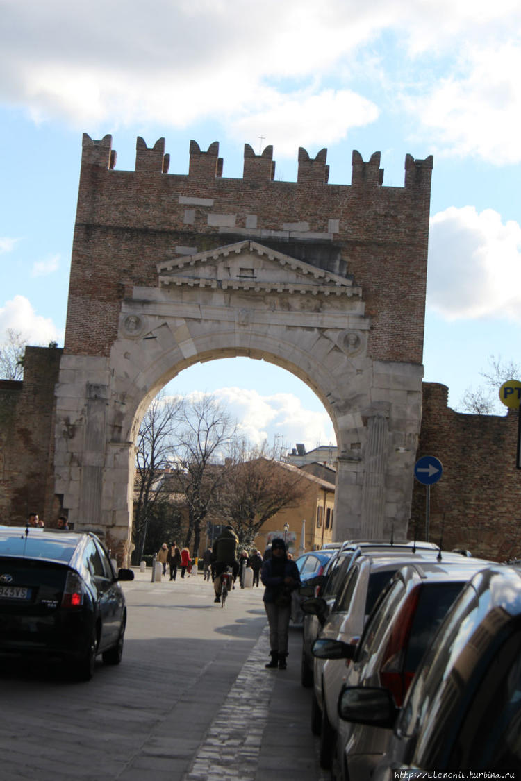 не замечаешь как доходишь до Триумфальной Арки Августина, она настолько древняя была возведена в 27 году, внимание, до нашей эры, вот это круто!!! Она была частью античного городского поселения, украшена головами быков — символом города Римини, времен Римской империи, а ее размеры, толщина стен — впечатляет конечно!!!