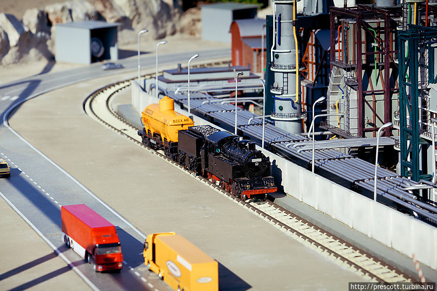 Между объектами проложены миниатюрные дороги и железнодорожные пути. Построены речные порты и аэропорты.