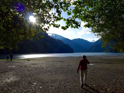 Т.Сталин дважды объезжал озеро. Когда мы проезжали мимо ресторана, народ горячо приветствовал вождя, аплодировал ему, раздавались громкие крики “ура!”. Эхо разносилось по озеру и горным ущельям, пока мы не скрылись за поворотом. Т. Сталин отвечал на приветствия, сняв фуражку, махая рукой. Природа в этих местах прекрасная. Вокруг озера растет много деревьев разных пород, преимущественно стройные пихты.