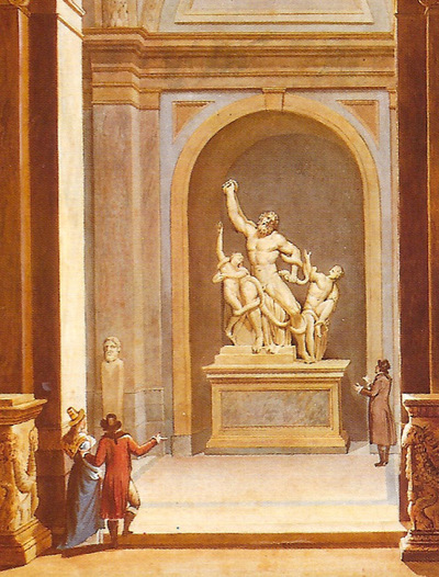 Частичный вид на двор Бельведера (Cortile del Belvedere) с Лаокооном. Раскрашенная вручную гравюра Луи Дюкро и Джованни Вольпато, 1787—1792 гг. На этой гравюре мы видим Лаокоона, реставрированного Корнаккини. Следует отметить, что правая рука младшего сына, как и рука отца, поднята вверх. Фото: Grand Tour.(из Интернета)