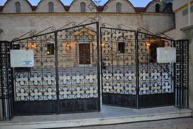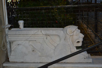"Санта-Мария" - главный католический храм Родоса, расположенного буквально в двух шагах от отеля — этот храм был православным, что выяснилось вечером того же дня.Хотя ворота, вход в которые охраняли вот такие мраморные фигуры, были приоткрыты, но храм был закрыт в вечернее время.