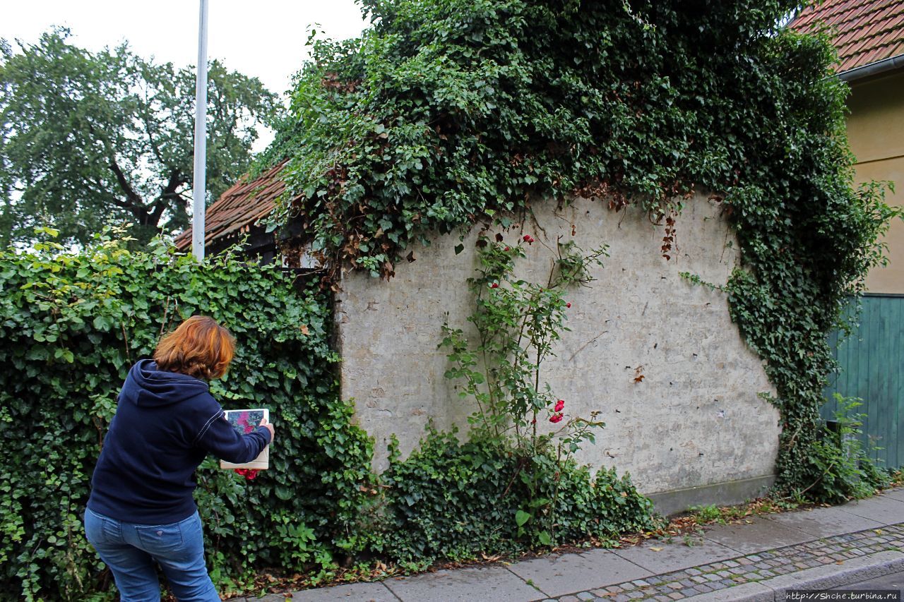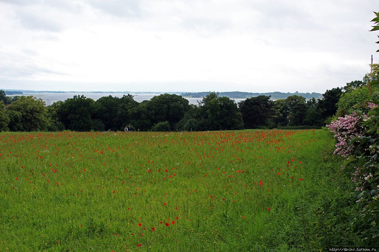 Внезапно домики заканчиваются, и начинается поле маков! Но это не просто красивый луг на окраине города. Это участок огромного парка Byparken, который протянулся сюда от самого Roskilde Fjordа. На этом участке находится руина разрушенной во время чумы 1711 года церкви Sankt Hans Kirke. Точнее там даже не руина, а табличка, где эта церковь находилась... Мы туда не пошли:))