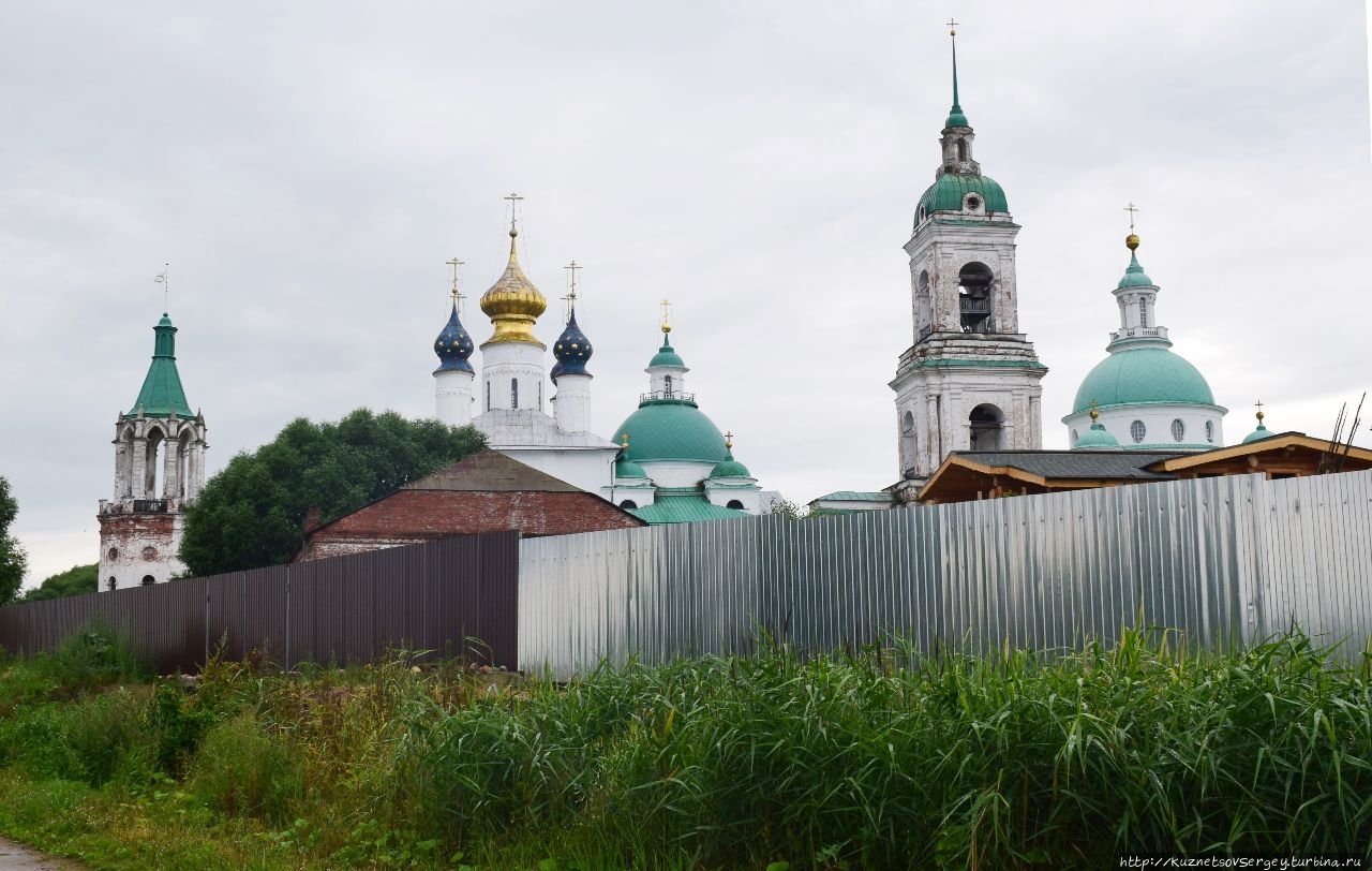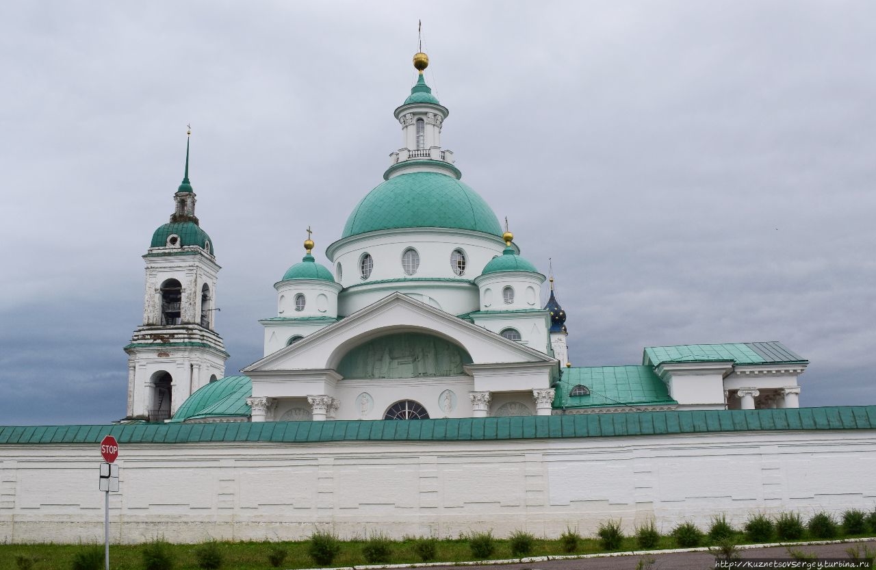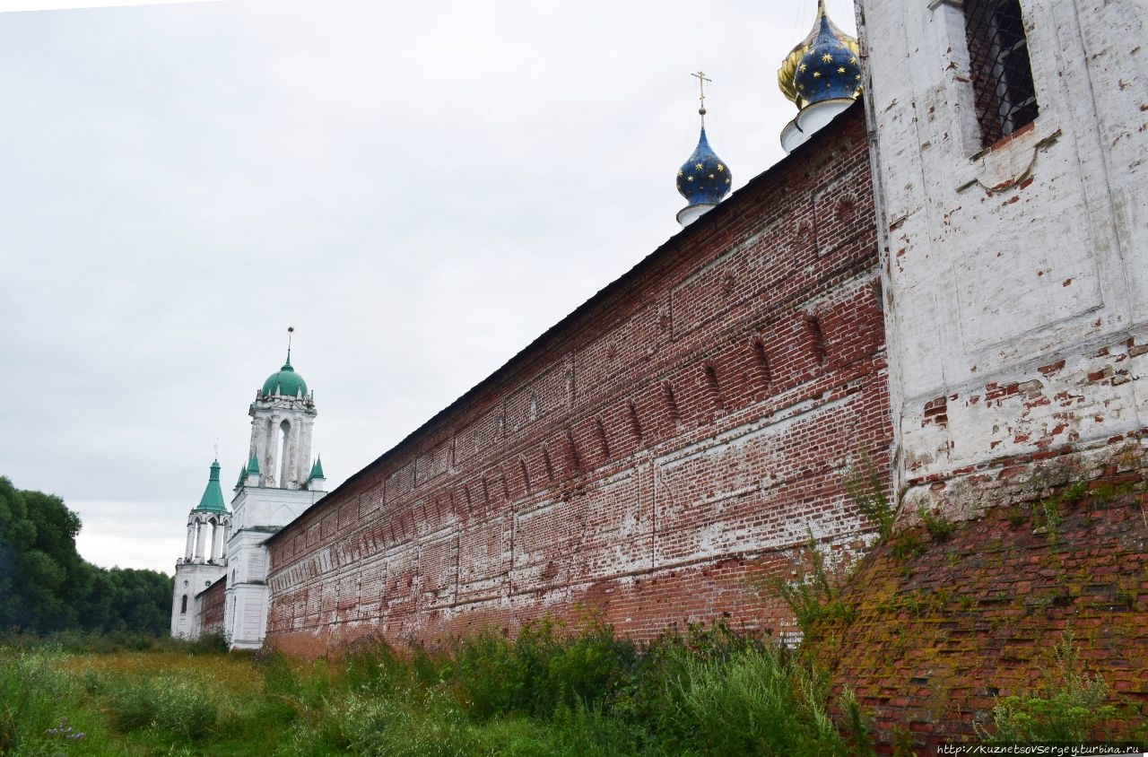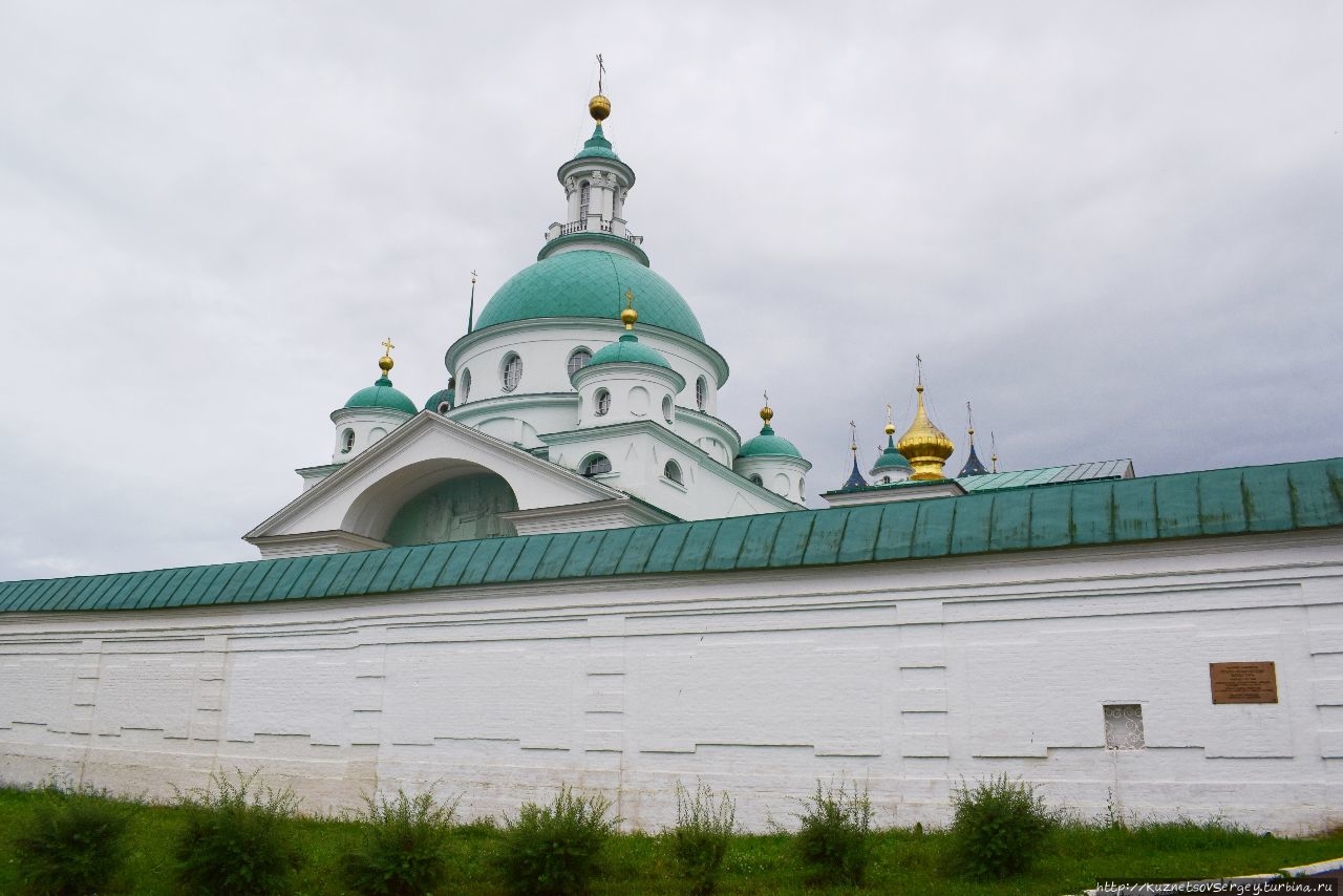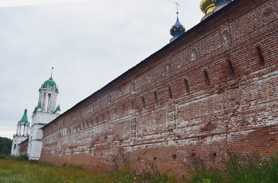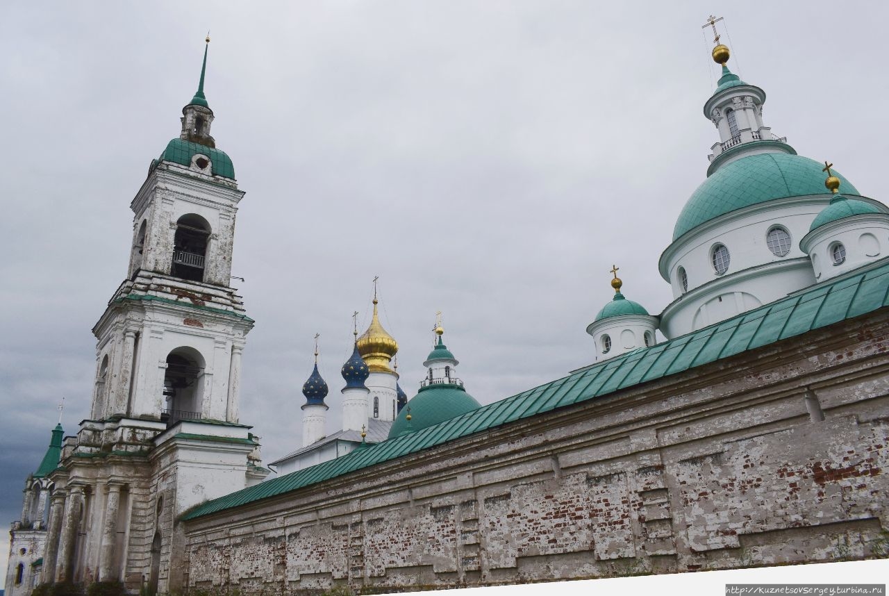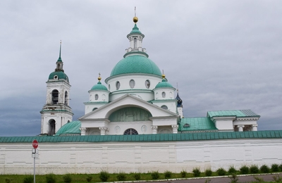 Монастырь был основан в XIV-ом веке. Каменный собор был построен в конце XVII-го века. Находится севернее Ростовского кремля. Сейчас там идет серьёзная реконструкция, для туристов прохода нет. Но и со стороны кирпичные стены монастыря и собор в лесах производят впечатление.
